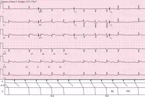 - Раптове і несподіване "випадіння" скорочення шлуночків при збудженні передсердь, без необхідності попереднього подовження інтервалу PQ. Тільки кожне 2-ге, 3-тє чи 4-те скорочення передсердя передається на шлуночки (2: 1 або 3: 1 або 4: 1 - блокада). Ця форма блокади, здебільшого розташовується в пучку Гіса, та називається блоком Мобітца . Прогноз є менш сприятливим порівняно з блокадою Венкебаха.