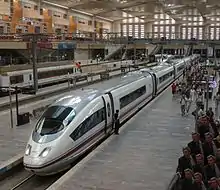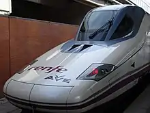 - AVE Серія 103 — поїзди німецької фірми Siemens, з сімейства Velaro (на базі цього сімейства виготовляються і російські електропоїзди ЕШС «Сапсан»), були замовлені РЕНФЕ в 2001 році. Через складнощі з постачальниками, компанії Siemens довелося виготовляти відсутні компоненти самостійно, що призвело до значних затримок контракту (які обійшлися компанії в 21 мільйон євро), але дозволило використовувати платформу поїзда в своїх подальших розробках (докладніше Siemens Velaro). Замовлення на 16 поїздів було виконане в 2005 році, тоді ж компанія РЕНФЕ замовила ще 10 поїздів цієї серії. 4 з восьми вагонів обладнані тяговими візками, розподіленими по складу, на відміну від серій 100 і 102, де необхідні локомотиви з кожного боку поїзда. Встановлена максимальна швидкість — 350 км/год (рекорд 404 км/год[3]). Місткість поїзда — 404 людини.