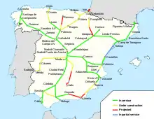 Перша ділянка будівництва лінії європейської колії від Мадрида до французького кордону Мадрид — Сарагоса — Леріда завершується в 2003 з запуском в комерційну експлуатацію 11 жовтня 2003 дальніх поїздів AVE які з'єднують ці міста з містами Єбес, Гвадалахара і Калатаюд . Через неготовність лінії і техніки до системи сигналізації в перші роки рух по лінії було обмежено швидкістю 200 км/год. Ця лінія є першою в Іспанії електрифікованою змінним струмом 50 Гц 25 кВ .