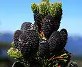 Пилкові шишки від фіолетового до пурпурно-зеленого кольору, зосереджені в нижній частині крони на 1-річних гілках. Насіннєві шишки від темно-фіолетово-синього до сіро-фіолетового кольору з округленою вершиною, сидячі, розміром 5–12 × 2–4 см, ростуть окремо або невеликими групами у верхній частині крони дерева. При дозріванні на початку осені вони стають коричневими. Насіння розміром 5–7 × 2–3 мм, коричневого кольору з світло-коричневими крилами приблизно в 1,5 раз більшими за насіння. 2n = 24.