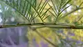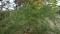 Прилистки відсутні або дуже дрібні. Листки двічіпарнопірчасті, завдовжки 18-26 см, завширшки 12-18 см, світло-зелені. З 9-11 пар гілок голого стрижня, кожна гілка якого несе 16-44 пари вузько лінійних, майже голчастих голих листочків завдовжки близько 6-7 мм, завширшки до 0,5 мм, розміщених відносно рідко. Основа черешка злегка роздута. Приквітки на коротких черешках з розширеною частиною буро-охристого забарвлення, по краю опушені довгими волосками.