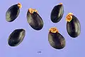 Плід — плаский біб завдовжки до 8,8 см, завширшки до 0,7 см, прямий або злегка зігнутий, темно-коричневий, майже чорний. Насіння довгасте, сочевицеподібні, чорне, лискуче.
