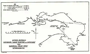 У битві 13 грудня 1939 біля гирла річки Ла-Плата крейсер вступив в бій з британськими кораблями: важким крейсером «Ексетер» та двома легкими крейсерами класу «Ліндер» — «Аякс» й «Ахіллес». «Ексетер» втратив дві передні башти, передню бойову рубку, дістав інші пошкодження і вийшов з бою, хоча й залишився на плаву. Легкі крейсери також дістали ушкодження. Сам «Адмірал граф Шпее» втратив одну 150 мм гармату, системи очищення моторної оливи, а також інші пошкодження, які змусили капітана корабля Ганса Лянґсдорфа направити крейсер до найближчого нейтрального порту — Монтевідео, переслідуваного на безпечній дистанції британськими легкими крейсерами. Лянґсдорф розраховував здійснити ремонт корабля у порту і дочекатися прибуття німецьких підводних човнів, проте під тиском Британії уряд Уругваю не дозволив Лянґсдорфу залишатися там довго і зобов'язав покинути порт. Одночасно поширювалася дезінформація про швидке наближення британського лінійного крейсера «Рінаун» з 381-мм гарматами й авіаносця «Арк Роял».