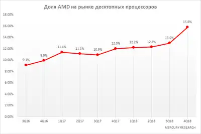 За 2018—2021 роки AMD нав'язала серйозну конкуренцію на ринку x86 сумісних процесорів[6][7][13]. Станом на 2 січня 2020 року частка AMD на ринку процесорів досягла 34,6 % згідно з офіційним сайтом PassMark.