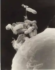 ![]() Електронна мікрофотографія A. tumefaciens в процесі інфікування клітини моркови | ||||||||||||||