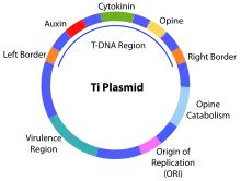 A. tumefaciens штаму С58 містить два плазміди: At-плазміду і Ti-плазміду. At-плазмида (від Agrobacterium tumefaciens) є кільцевою дволанцюжковою молекулою ДНК розміром 542868 пар основ і містить 557 генів, з яких 542 кодують білки[11]. Ti-плазмида (від англ. tumor inducing) обумовлює патогенність A. tumefaciens і здатна вбудовуватися в геном рослини-господаря, переносячи Т-ДНК в процесі сайт-специфічної рекомбінації[12][13], плазміда також може частково вбудовуватися в геном Saccharomyces cerevisiae шляхом незаконної рекомбінації[14]. Проте зараження мишей патогенними A. tumefaciens не викликає експресії генів-репортерів в тканинах[15]. Ti-плазміда A. tumefaciens штаму С58 є кільцевою двуцепочечную молекулою ДНК розміром 214233 пар основ і містить 199 генів, з яких 197 кодують білки[16]. Ця плазміда містить гени, що контролюють біосинтез і катаболізм специфічних амінокислот, — опінів[17], що використовуються як джерело живляння цієї бактерії (октопін, нопалін, агропін)[18], гени вірулентності, гени синтезу фітогормонів — цитокінінів і ауксинів (власне вони викликають утворення пухлин і дедиференціювання тканин рослини), Т-ДНК власне і є інтегрованою ділянкою Ti-плазміди, що несе гени синтезу фітогормонов і опінів[19].