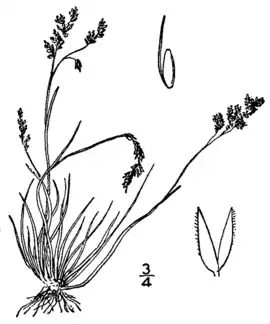 Суцвіття відкриті, пірамідальні, завдовжки 5–15 см. Первинні гілочки суцвіття розлогі, довжиною 1–4 см. Вісь і гілочки суцвіття гладкі або шершаві. Колоски поодинокі. Родючі колоси з квітоніжками. Родючі колоски містять 1 родючу квіточку. Колоски еліптичні, стиснуті з боків, 2.5–3 мм завдовжки, розпадаються при зрілості. Колоскові луски стійкі, подібні, блискучі, перевершують верхівки квіточок, міцніші, ніж родючі леми. Нижня колоскова луска ланцетна, 2.5–3 мм довжиною, 1-кілева, 1-жильна, верхівка гостра. Верхня колоскова луска такої ж довжини та інших характеристик. Родюча лема (нижня квіткова луска) еліптична, довжиною 2–2.5 мм, гіалінова, без кіля, 5-жильна. Верхня квіткова луска відсутня або крихітна. Пиляків 3; завдовжки 0.75–1.5 мм. Плід (зернівка) — однонасінний, безчерешковий, сухий, 1.3–1.7 мм довжиною, не розщеплюється, коли стиглий.