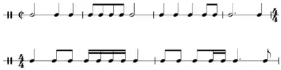 ![]() Ритм записаний на 2 2 і той самий ритм записаний на 4 4. Через меншу кількість вісімок і шіснадцяток при записі в 2 2, останній вважається легшим для читання швидкої музики.[4] |