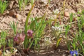 Цибулин 1–5, від яйцюватих до кулястих, 0.7–1.5 × 0.6–1.4 см; зовнішні оболонки від коричневих до сірувато-коричневих, перетинчасті; внутрішні оболонки від червоних до пурпурних або білі. Листки як правило, стійкі, зелені в період цвітіння, 2, листові пластини плоскі або жолобчасті, 8–27 см × 1–3 мм, краї цілі. Стеблина стійка, поодинока, пряма, 3–10(20) см × 1–3 мм. Зонтик стійкий, прямостійний, компактний, 8–25-квітковий, півсферичний, цибулинки невідомі. Квіти дзвінчасті, 5–8 мм; листочки оцвітини прямостійні, білі з яскраво вираженою від зеленої до пурпурової серединної жилки, від ланцетоподібних до еліптичних, ± рівні, на верхівці стають звивистими і жорсткими, краї цілі, верхівка від тупої до загостреною. Пиляки жовті; пилок жовтий або білий. Насіннєвий покрив блискучий. 2n = 14[1].