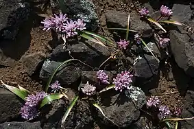Цибулин 1–3, яйцюваті, 1.5–2.5 × 1–2 см; зовнішні оболонки містять 1 або більше цибулин, коричневі або сірі, перетинчасті; внутрішні оболонки білі. Листки в'януть від кінчика в період цвітіння, 1–2, базально розлогі; листові пластини плоскі або широко жолобчасті, 10–30 см × 1–21 мм, краї цілі. Стеблина поодинока, прямостійна, 2–12 см × 1–3 мм. Зонтик стійкий, прямостійний, компактний, 20–30-квітковий, півсферичний, цибулинки невідомі. Квіти дзвінчасті, 7–14 мм; листочки оцвітини прямостійні, білі або рожеві до пурпурного забарвлення з темно-зеленувато-коричневими або пурпурними серединними жилками, ланцетно-довгасті, еліптичні або ± обернено-ланцетні, ± рівні, краї цілі, верхівка тупа. Пиляки жовті; пилок жовтий. Насіннєвий покрив тьмяний. 2n = 14, 28[1].