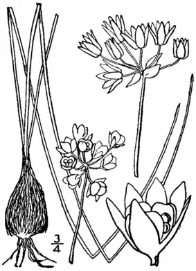Цибулин 1–5, яйцюваті, 1–1.8 × 0.7–1.5 см; зовнішні оболонки містять 1 або більше цибулин, коричневі, сітчасті; внутрішні оболонки білуваті або коричнюваті. Листки стійкі, зелені в період цвітіння, 2–5; листові пластини плоскі, жолобчасті, 10–30 см × 1–3(5) мм, краї цілі. Стеблина стійка, поодинока, прямостійна, 10–30 см × 1–3 мм. Зонтик стійкий, прямостійний, компактний до ± нещільного, 10–25-квітковий, півсферично-кулястий, рідко заміщується цибулинками. Квіти дзвінчасті до ± зірчастих, 6–9 мм; листочки оцвітини білі, рожеві або червоні, рідко зеленувато-жовті, від яйцюватих до ланцетних, ± рівні, на плодах стають паперовими і жорсткими, краї цілі, верхівки тупі або гострі. Пиляки жовті; пилок світло-жовтий. Насіннєвий покрив блискучий. 2n = 14, 28[1].
