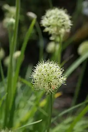 Корені подовжені, товсті, м'ясисті. Цибулини кластеризовані, циліндричні, оболонки перетинчасті. Листки від лінійних до широких, коротші майже рівні стеблині, 0.5–1 см завширшки, середня жилка чітко виражена. Стеблина (10)20–60 см. Зонтик від півсферичного до кулястого, багатоквітковий. Оцвітина біла або зеленувато-жовта до жовтої; сегменти схожі, ланцетні, 4–7.5 × 1–1.5 мм, верхівка загострена, іноді неоднаково 2-лопатева[1].