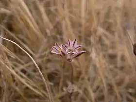 Цибулина яйцювата або субкуляста діаметром 4–6 мм. Стебло заввишки до 10 см, максимальний діаметр до 1 мм, гладке, вкрите листовими оболонками в нижній половині. Листків 4–5, тонкі, зелені, сплюснуті, 2–5 см завдовжки і 0.8–1.5 мм завширшки, з 5 скошеними ребрами на спинній поверхні. Суцвіття з 2–12 квіток. Оцвітина урноподібна; листочки оцвітини від рожево-білих до пурпурових, ланцетоподібних і гострих на верхівці, завдовжки 5–7 мм і шириною 1–1.2 мм, з виноградно-пурпуровою центральною жилкою, коротко сплавлені біля основи кільцем. Коробочка завдовжки 4 мм і шириною 3.5–4 мм, субкуляста[1].