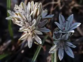 Цибулин 1–5, яйцюваті, 1–2 × 0.8–1.8 см; зовнішні оболонки містять 1 або більше цибулин, коричневі, перетинчасті; внутрішні оболонки білі. Листки, як правило, скидаються зі стеблиною, в'януть від кінчика в період цвітіння, 1–2; листові пластини плоскі або ± широко-жолобчасті, 5–22 см × 0.5–14 мм, краї цілі. Стеблина утворює шар опадання і скидається після дозрівання насіння, одиночна, прямостійна, циліндрична, 2–17 см × 0.5–2 мм. Зонтик стійкий, прямостійний, компактний, 6–65-квітковий, півсферичний, цибулинки невідомі. Квіти дзвінчасті, 4–12 мм; листочки оцвітини прямостійні, білі або рожеві з темно-пурпуровими серединними жилками, від ланцетних до довгасто-еліптичних, ± рівні, краї цілі, верхівки від тупих до гострих. Пиляки жовті або пурпурні; пилок жовтий. Насіннєвий покрив тьмяний[1].