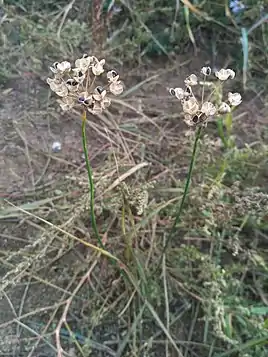 Суцвіття — малоквітковий напівсферичний або кулястий зонтик. квітконіжки рівні. Оцвітина пурпурно-червона; сегменти з помітною серединною жилкою, від широко еліптичних до яйцюватих, (4)5 мм; верхівка тупа; зовнішні човноподібні; внутрішні трохи довші, ніж зовнішні. Число хромосом 2n = 16[1].