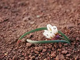 Цибулин 1–5, від кулястих до яйцеподібних, 1–2 × 0.8–2 см; зовнішні оболонки червонуваті або коричнюваті, перетинчасті; внутрішні — білі або світло-коричневі. Листки 6–15 см × 2–4 мм. Зонтик прямостійний, компактний, 5–12-квітковий, півсферичний, цибулинки невідомі. Квіти дзвінчасті, 6–8 мм; листочки оцвітини прямостійні, білі або рожеві з зеленими серединними жилками, стають червонувато-пурпурними, широко еліптично-довгастими, ± рівні, стають жорсткими. Пиляки пурпурні; пилок від білого до сірого. Насіннєвий покрив тьмяний. 2n = 14[1].