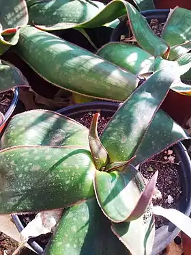 Багаторічна трав'яниста рослина без стебла, з м'ясистим листям в компактній розетці, розширеним у основи. Біля основи листя під землею утворює бульбу діаметром близько 5 см. Листків — 6-10, скручуються, найвищі мають до 28 см завдовжки, епідерміс яскраво-зелений, нижня сторона листя темніша і обидві сторони прикрашені великою кількістю дрібних білих плям. Зубчики дуже дрібні, м'які, завдовжки близько 1 мм. Суцвіття високе 45-90 см, просте, циліндричне 20-30x6-8 см і несе коралові, рожеві, від 3,0 до 4,0 см великі квіти, які можуть мати жовті краї. Рослини мають значнимй період спокою, в який листя висихає.