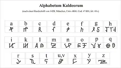 Alphabetum Kaldeorum є одним з найвідоміших шифрів Середньовіччя. Його назва походить від назви халдеїв, яких вважали такими, що мають таємничі й чарівні знання.