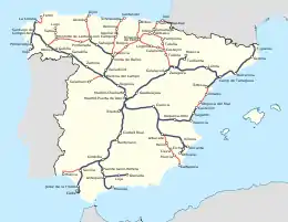 - Барселона — Віго, через Льєріду, Сарагосу, Памплону, Віторію-Гастейс, Бургос, Леон, Понферраду та Оренсе, із послугами сполучення з Хіхоном в Леоні та Ла-Коруньєю в Монфорте-де-Лемос.