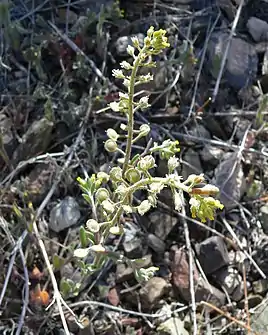 Однорічна рослина 10–35 см заввишки. Вся рослина шорсткувата від короткого зірчастого запушення, гіллясте від основи. Листки стеблові оберненояйцеподібні, з б.-м. чіткими черешками. Стручечки вкриті тільки зірчастими волосками. Пелюстки приблизно 3 мм завдовжки. Зав'язі після відцвітання жовтуваті[2]. Чашолистки довгасті, 1.7–2.3 × 0.8–1.1 мм. Пелюстки блідо-жовті. Насіння найчастіше 2 на локулу, яйцеподібні, 1.6–2 × 1.2–1.5 мм, злегка стиснене. 2n = 16[3].