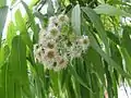 Листя темно зелені, ланцетоподібні 6-16 см довжини 2-3 ширини. Розміщенні супротивно парами на гілках.