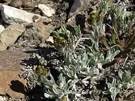 Рослини висотою 5–12 см; багаторічні трави, ростуть у пучках. Наявні лише волокнисті корені (волокнисті коріння з підземних стеблів). Рівня землі або підземні стебла горизонтальні або вертикальні, столоноподібні, компактні, шириною 1–5 мм. Стеблекорінь присутній (між базальними пучками листя і корінням). Надземні стебла вертикальні. Листя в основному базальні, або базальні в розетці, чергові, залишаються прикріпленим до стебла засохлими. Черешки відсутні. Листові пластини довжиною 4–12 мм, шириною 1.8–2.4 мм, ланцетні й загострені при основі, плоскі, з непримітними жилами. Верхня поверхня листа волосата, волоски прості, білі або напівпрозорі або сірі. Нижня поверхня листа волосата, волоски дуже щільні, білі. Верхівки листя загострені, гострі чи тупі (верхні листки квітучих стебел закінчуються коричневими, лускоподібними гладкими «прапорами» довжиною до 2 мм).