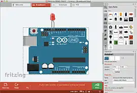 Розробка апаратного забезпечення на базі Arduino може виконуватись в середовищі Fritzing.