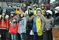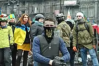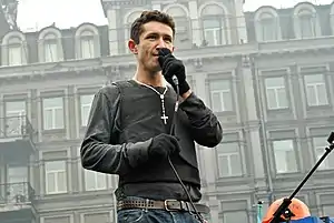 | Artisto (Ростислав Хитряк) під час запису відеокліпу на вулиці Михайла Грушевського в Києві 10 лютого 2014 року | |