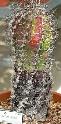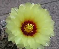 Стебло спочатку кулясте, пізніше циліндричне, виростає до 25 см у висоту і 15 см у діаметрі. Ребер зазвичай 8. Вони високі, гострі, прямі. Епідерміс темно-зеленого кольору, покритий великими жовтими пластівцями, особливо густими на верхівці. На старому прирості пластівці біліють. Зігнуті і безладно переплетені колючки досягають довжини 8 см вони сплощені і забарвлені в темно-бурі тони. З віком колючки нижньої частини стебла опадають. Квіти до 10 см в діаметрі, яскраво-жовті, з червоним центром.