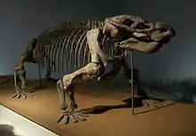 Череп дуже широкий, низький, з кістковими виростами перед очима. Ширина черепа більше довжини. Верхні ікла невеликі, інші зуби відсутні, мав широкий роговий дзьоб. Тіло масивне, ноги товсті і досить короткі. Довжина черепа до 40 см, загальна довжина до 2 м.