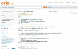 BIBSYS пропонує дослідникам, студентам та усім іншим легкий доступ до бібліотечних ресурсів, надаючи єдину пошукову службу Oria.no та інші бібліотечні послуги.[3] Він також забезпечує інтегровані продукти для внутрішньої роботи науково-дослідних і спеціальних бібліотек, а також відкриті освітні ресурси.[4] Зведений електронний каталог BIBSYS відбиває фонди не лише Національна бібліотека Норвегії, але й багатьох університетських і наукових бібліотек Норвегії. Окрім норвезького, він має англомовний інтерфейс, що дозволяє проводити пошук за традиційним набором полів, серед яких — індивідуальний і колективний автори, заголовок, ключові слова, предметні рубрики, а також ISBN і ISSN.