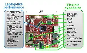 Розмір плати становить приблизно 3.25 х 3.25". Центральний процесор плати, OMAP3530, заснований на ядрі ARM Cortex-A8 і включає в себе процесор цифрових сигналів TMS320C64x + (прискорення обробки відео-і аудіоданих) і PowerVR SGX530 (прискорювач 2D/3D графіки, підтримує OpenGL ES 2.0).