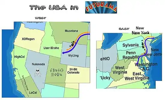 - Пенсільванія розділилася на дві частини: «Республіка Пенн» і «Сильванія»: натяк на розділ Чехословаччини на Чехію (в англомовній географічній номенклатурі «Чеська Республіка») і Словаччину.