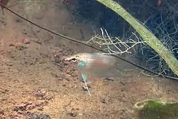 У самців тіло червонувато-коричневе, черево світліше. Луски на боках мають по центру зеленкувато-блакитну блискучу цятку. Зяброві кришки та горло відсвічують зеленкувато-блакитним кольором. Нижня губа чорна, коротка горизонтальна чорна смуга проходить через око, чорне маркування присутнє також у нижній частині голови. Вздовж тіла проходять 3 темні смуги: верхня від верхнього краю ока до верху основи хвостового плавця, центральна — серединою тіла, а нижня — від низу основи грудного плавця до низу основи хвостового плавця, поєднуючись із центральною смугою над задньою третиною анального плавця. Присутня чітка цятка в основі хвостового плавця.