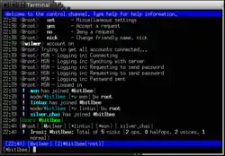 ![]() Скріншот irssi, поєднаного з Bitlbee сервером для спілкування через Windows Live Messenger | |