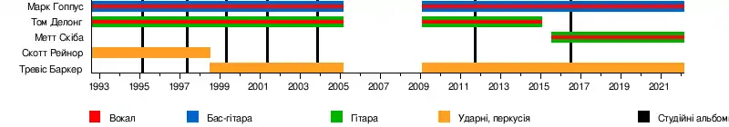 Том ДеЛонг покинув Blink-182 у 2005 році, відправивши гурт у «безстрокову відпустку». Том заснував окремий проект Angels & Airwaves, в той час як Марк Гоппус і Тревіс Баркер створили гурт +44. Учасники Blink-182 возз'єдналися в лютому 2009 року і вже у вересні 2011 вийшов їхній новий альбом Neighborhoods. У 2015 році Том Делонг знову покинув гурт. На його місце був запрошений гітарист гурту Alkaline Trio Метт Скіба.