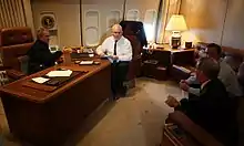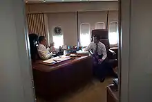 Фронтальна частина літака зветься «Білий Дім». Робочий кабінет президента містить два дивани-ліжка, вбиральню та душ, шафку-трюмо, подвійну раковину, а також приватний покої або президентський повітряний Овальний Кабінет. При потребі президент може звернутися до своїх громадян просто з офісу. Дана можливість була запроваджена після атак 11 вересня, після яких Борт номер Один повинен був здійснити посадку на базі ВПС США в Барскдейлі для звернення президента до народу. in order for President Джорджа В. Буша.[4] Згадані офіси, включаючи президентський номер, переважно розташовані на старборті, які з'єднуються довгим коридором уздовж портборта. Там же міститься зона для двох агентів Секретної служби США. Повітряне судно також містить конференц-зал, оригінально збудованого як кімнату нарад situation room, однак поточно використовується для зустрічі з персоналом під час перельоту. В даній кімнаті присутній 50-дюймовий плазмовий екран, що може працювати в режимі телеконференцій. Офіси повітряного судна повноцінно оснащені системами телекомунікацій (87 телефонів та 19 ТБ-систем).