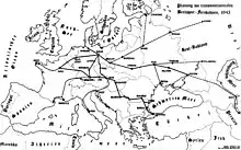- Північ-Південь-Паралель: Столиця світу Германія (Берлін) — Дрезден — Усті-над-Лабем — Прага — Їглава — Зноймо — Відень — Трієст — Рим