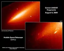 ![]() Зображення комети, отримане телескопом Габбл 5 серпня 2000 року, комета руйнується |