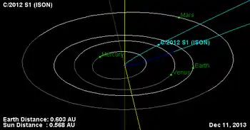 Комета C/2012 S1 (ISON) досягне свого перигелію (найбільшого зближення із Сонцем) 28 листопада 2013 року на відстані в 0,012 а.о. (1,8 млн км) від центра світила[2][9]. Враховуючи той факт, що радіус Сонця становить 695.500 км, комета пролетить приблизно в 1,1 млн км від сонячної поверхні. Орбіта комети близька до параболічної, що може вказувати на походження небесного тіла із Хмари Оорта[10][11].