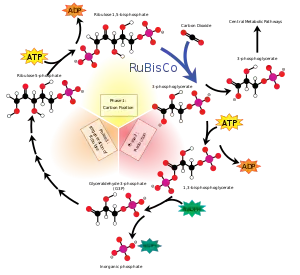 - CO2 + H2O + РуБФ → (2) 3-фосфогліцерат.