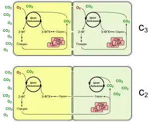 У C3-рослин темнові реакції фотосинтезу починаються з фіксації CO2 ферментом Рубіско на акцепторі рибулозо-1,5-бісфосфаті з утворенням двох молекул 3-фосфогліцерату. Однак через подвійну, карбоксилазну та оксигеназну активність Рубіско, частина субстрату для фіксації CO2 взаємодіє з киснем і окиснюється, що призводить до втрати субстрату та енергії, а також викликає додаткові витрати з утилізації утвореної двохвуглецевої сполуки, 2-фосфогліколату. Сума цих процесів називається фотодиханням і робить суттєвий внесок у зниження загальної ефективності фотосинтезу.