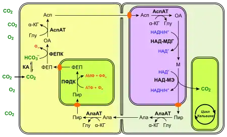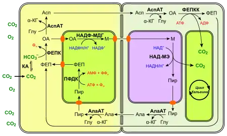 Оксалоацетат, що утворюється в результаті карбоксилювання ФЕП, з допомогою специфічного переносника транспортується в хлоропласти, де відновлюється НАДФ-малатдегідрогеназою до малату. Утворений малат виноситься в цитозоль і дифундує з клітин мезофілу в клітини обкладки через плазмодесми. Малік-ензим, який локалізований в хлоропластах клітин обкладки, каталізує перетворення малату в піруват з виділенням CO2, який фіксується Рубіско. Утворенний піруват за участі специфічного переносника експортується з хлоропластів клітин обкладки та дифундує через плазмодесми в клітини мезофілу, де він з допомогою іншого переносника входить у хлоропласти, де фермент піруватфосфатдикіназа знову перетворює його у ФЕП[12].