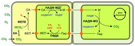- ФЕП-карбоксикіназний тип: Малат декарбоксилюється в мітохондріях за НАД-малатдегідрогеназним типом, але на додаток відбувається пряме декарбоксилювання оксалоацетату в цитоплазмі ФЕП-карбоксикіназою з витратою однієї молекули АТФ і утворенням ФЕП.