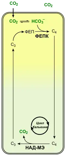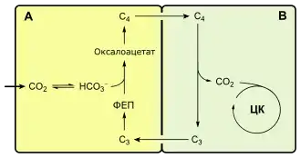 ФЕП-карбоксилаза каталізує необоротну конденсацію молекул ФЕП і HCO3− з утворенням оксалоацетату. ФЕП-карбоксилаза має дуже високу спорідненість із ФЕП. Оксалоацетат перетворюється в малат або ж в аспартат і в такому вигляді транспортується в клітини обкладки, де знову стає малатом і піддається окиснювальному декарбоксилюванню: