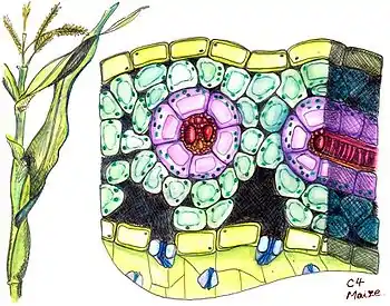 Для C4-рослин характерна особлива структура листа, так звана кранц-анатомія (нім. Kranz — корона, вінець). Вперше такий тип будови листа був описаний 1884 року німецьким ботаніком Готлібом Хаберландтом[7]. Провідні пучки у таких рослин оточені двома шарами зелених клітин асиміляційної паренхіми. Зовнішній шар утворюють клітини мезофілу, не диференційованого на губчасту і палісадну паренхіму, а внутрішній — клітини обкладки судинного пучка. Клітини обкладки зв'язані з клітинами мезофілу великою кількістю плазмодесм, завдяки чому між ними можливий активний обмін метаболітами. Особливістю будови листа C4-рослин є наявність не більше 2—3 шарів клітин мезофілу, що дозволяє легко обмінюватися продуктами фотосинтезу через плазмодесми. Клітини мезофілу та клітини обкладки провідного пучка відрізняються структурно й функціонально. Клітини мезофілу дрібні, розташовані пухко, хлоропласти в них завжди мають грані та вони рідко містять крохмаль. У цих клітинах і розташовується ФЕП-карбоксилаза, яка приєднує CO2 до фосфоенолпірувату з утворенням оксалоацетату. Клітини обкладки більші, з потовщеною, часто суберинізованою, клітинною стінкою, щільно прилягають до судин листа, хлоропласти в них можуть не мати гран і часто містять зерна крохмалю. Тут локалізується фермент Рубіско та протікає звичайний цикл Кальвіна[8].