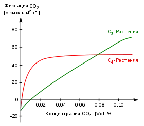 C4-рослини мають ефективний механізм асиміляції CO2 через фермент ФЕП-карбоксилазу та слабке фотодихання, тому їхня точка компенсації CO2 прямує практично до нуля (< 0,001 об'ємних відсотків CO2[59]). Як видно з графіка, швидкість фотосинтезу в C4-рослин при низькому вмісті CO2 зростає значно швидше, ніж у C3, тому при низьких концентраціях вуглекислого газу C4-рослини завжди мають конкурентну перевагу. Для більшості вищих C3-рослин точка компенсації CO2 відповідає доволі високим концентраціям і становить 0,005—0,015 % CO2[60] у навколишньому повітрі.