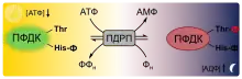 Піруватфосфатдикіназа (ПФДК) також є залежним від світла ферментом. Вона інактивується в темряві за рахунок фосфорилювання за залишком треоніну. Цю реакцію здійснює незвичайний біфункціональний ПФДК-регулюючий протеїн (ПФДК-РП чи ПДРП). Він одночасно має кіназну та фосфатазну активність. Фосфорилювання доволі незвичне, оскільки як донор фосфатної групи використовується переважно АДФ, а не АТФ. Незвична і реакція дефосфорилювання: замість молекули води ПФРП переносить відщеплювану фосфатну групу на вільний неорганічний фосфат (Фн) з утворенням пірофосфату (ФФн). Активність ПДРП залежить від рівня АДФ в стромі хлоропластів. АДФ є субстратом для кіназної активності та одночасно сильним конкурентним інгібітором фосфатазної. У темряві рівень АДФ значно підвищується, в результаті чого подавляється фосфатазна активність. На світлі, за рахунок фотофосфорилювання, концентрація АДФ різко зменшується, не залишається субстрату для кіназної реакції, а фосфатазна перестає подавлятися. В результаті ПДРП відщеплює фосфат від піруватфосфатдикінази та активує її[32].