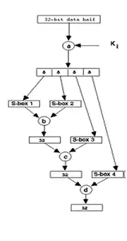 I = ((Kmi + Ri-1) <<< Kri) F = ((S1[Ia] ^ S2[Ib]) – (S3[Ic]) )+ S4[Id] |
