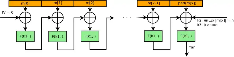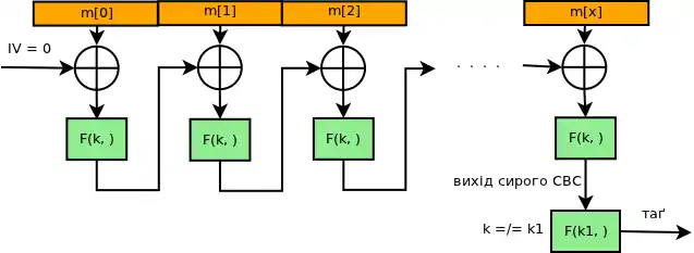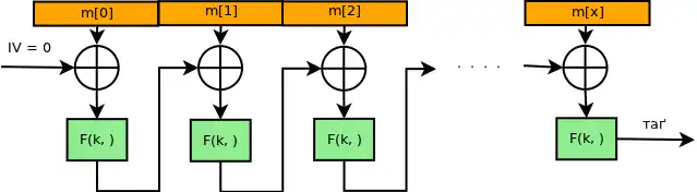 Для обчислення CBC-MAC повідомлення користувач шифрує в режимі CBC з нульовим ініціалізаційним вектором. Наступне зображення є нарисом обчислення CBC-MAC повідомлення з блоків секретним ключем і PRP (блочним шифром):